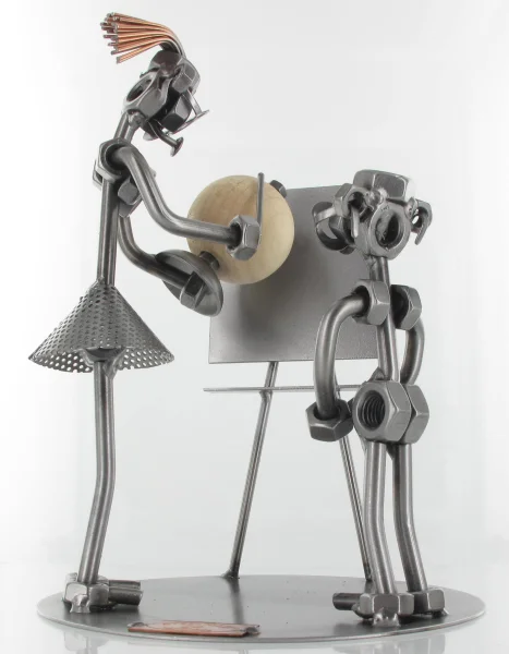 Lerares met leerling bij de aardrijkskundeles Onze Steelman figuren zijn van originele Steelman-kwaliteit en met liefdevolle hand gemaakt. Elk beeldje is uniek en voldoet aan de hoogste kwaliteitsnormen. Ze zijn gemaakt van schroeven, moeren, metaal en koper, met aandacht voor detail, in een intensief en creatief proces. Steelman24 producten zijn duurzame producten, en uitermate geschikt als kado voor iedere gelegenheid of als relatiegeschenk. Met onze stalen beeldjes hebt je altijd een bijzonder en uniek geschenk. En met meer dan 500 verschillende creaties uit alle situaties in het leven is er voor ieder wat wils.Productspecificaties